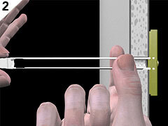 Drill 1/2" (Ø13mm) hole. Hold metal channel flat alongside plastic straps and slide channel through hole. Minimum clearance behind wall: 1 7/8" (48mm).