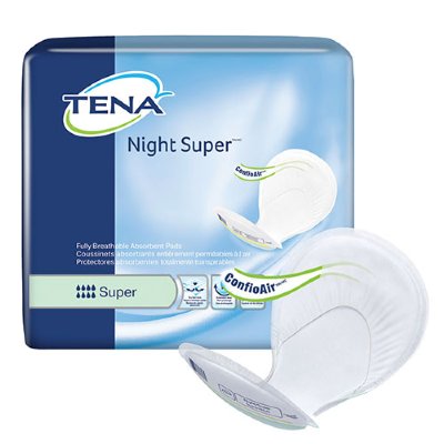 Night Super Maximum Absorbency Pads designed for secure use with TENA knit pants for moderate to heavy leaks.