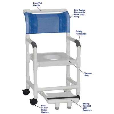 Healthcare Grade, Deluxe Extra Heavy Duty Vacuum Seat, Safety Handgrips, Push/Pull Handle And Fast Drying Removable Mesh Back/Sling, User Friendly Self Storing Sliding Footrest Support Prevents Foot Dragging And Entrapment, Reinforced At All Stress Related Areas.