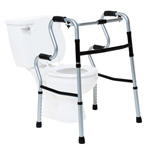 Combination of folding walker and rising aid all in one. The secondary handles provide stable assistance from a seated to a standing position. Attractive, upscale Onyx finish. Single release folding mechanism is designed to aid users with limited hand dexterity.  Can be used as a portable toilet safety frame.  Durable aluminum tubing provides strength while remaining lightweight.  Adjustable height fits a broad range of user heights. Contoured, plastic grips for enhanced comfort and a secure hold. Designed to meet the requirements of HCPCS code: E0135. Includes laminated color operating instructions.